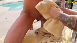 После бритья киски грудастая брюнетка выебана возле бассейна