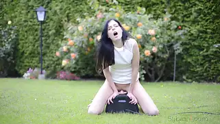 Порно видео Мастурбация, Секс - После утреннего купания в бассейне молодая брюнетка начинает стимулировать пизду вибратором, а затем выходит на лужайку с травкой и дрочится секс машиной