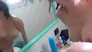 Голая красотка в душе трахается, классно отсасывая хуй партнёру на корточках