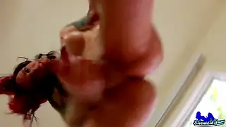 Порно видео В Сперме, Большими сиськами - Татуированный транс с рельефной фигурой и большими твердыми сиськами измазался маслом и принялся дрочить член, вскоре мы увидели мощное семяизвержение