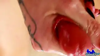Татуированный транс перемазался маслом и надрачивает член