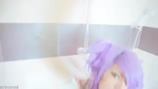 Телочка с синими волосами забралась в ванну и дрочит киску