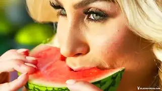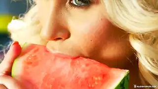 Порно видео Фетиш, Жена блондинка - Красивая грудастая блондинка устроила для зрителей настоящее буйство цветов и красок, телочка окружена цветами и сексуально есть арбуз перед камерой и публикой