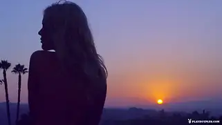 Красивая блондинка на закате раздевается и позирует у родника