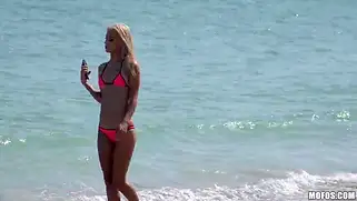 Русское на пляже порно голышом от сексапильной блондиночки в красном бикини