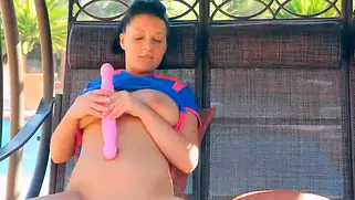 Порно видео Мастурбация, Большими сиськами - Молодая русская спортсменка с большими сиськами засунула в киску длинный самотык, красотка дрочит под навесом на свежем воздухе, соски телочки напрягаются
