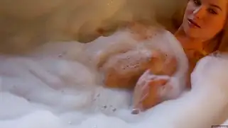 Красавица в пенной ванне получает оргазм от мастурбации киски