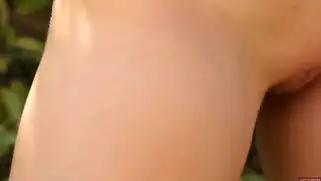 Белокурая прелесть в саду среди цветов дрочит киску и кончает