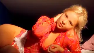 Русская блондинка Катя Рысь подрочила киску в ажурных чулочках