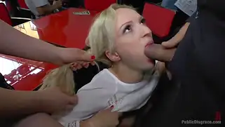 Порно видео Групповуха, Перед камерой - Нежную блондинку водят по городу полуголой, а затем красотка начинает сосать мужские члены публично и трахается с парнями перед камерой в стиле подчинения