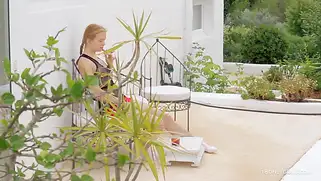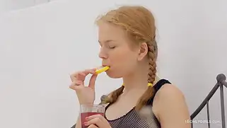 Рыжая телка с косичками дернула чая, разделась догола и позирует