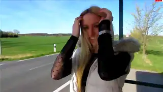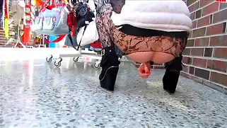 Красивая блондинка ходит по городу и достает из жопы анальные шарики