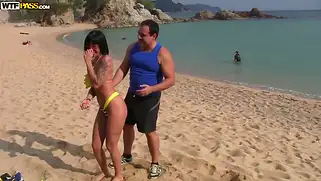 Порно видео Минет, Трахнул сучку - Мужик на пляже встретил сисястую брюнетку и красотка начала делать минет, затем парочка устроилась на камнях, где мужик выебал сучку и кончил в рот после траха