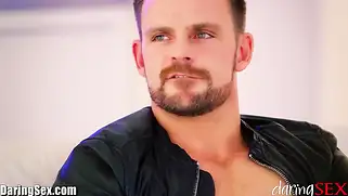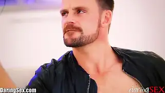 Байкер в кожаной куртке даёт отсосать сразу двум шлюшкам на диване