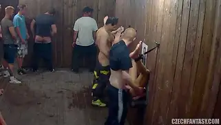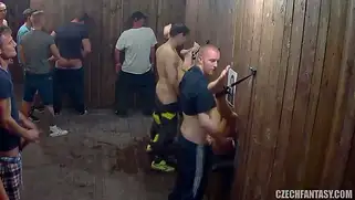 Prostoporno - Парни ебут привлекательных сучек через дырки в стене, глядя на фотографии красоток, некоторые самцы довольно быстро кончают куда придется после ебли кисок
