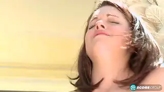 Тип трахает двух девушек поочередно и заливает титьки пышных блядей семенем