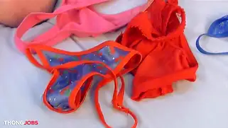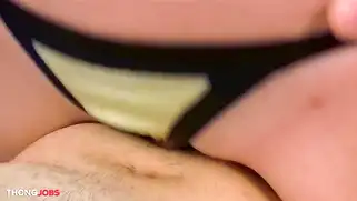 Телка взяла в руки член и обмотала его трусами, парень кончил