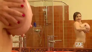 Толстая русая тёлочка принимает душ и массирует большие сиськи