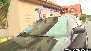 Загорелая девушка в белой блузке красива трахнута на лугу у машины
