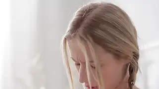Молодая нежная блондинка снимает одну вещь за другой и дрочит киску